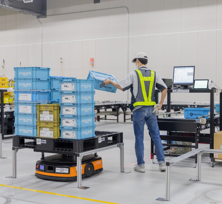 ※AMR:自律走行搬送ロボット。搬送ロボットとカメラがひとつになっており、障害物を避けながらの荷物搬送が可能 ※パレタイズロボット:荷物をパレットに乗せる&下ろすを人の代わりに実行するロボット